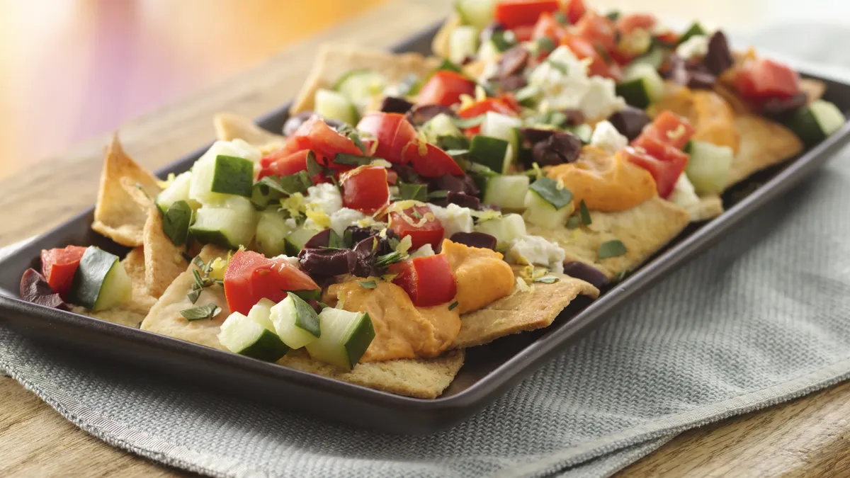 Here's a snack that couldn't be simpler! Purchased hummus and pita chips make tasty Mediterranean nachos in 20 minutes.